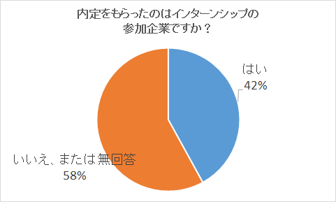 インターンシップ先から、42%が内定をもらっているインターンシップに参加した薬学生を対象に、インターンシップ先の企業から内定をもらったかどうかを問うと、42%が内定をもらったという回答がありました。インターンシップでも企業は、学生の働きをしっかりと評価しているようです。積極的な自己アピールの場と捉えましょう。また、職場を見ることでさまざまな気づきがあるはずです。就職の可能性を広げるチャンスとして、有効に活用するべきでしょう。